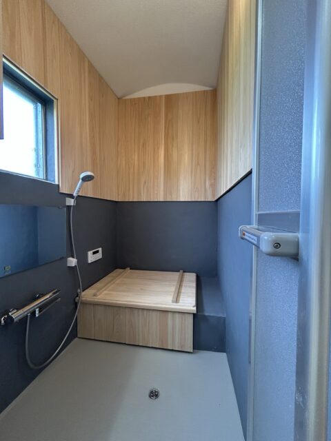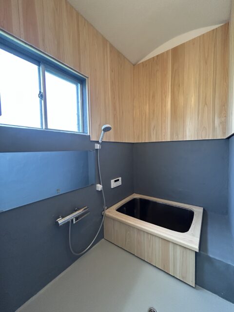 浴槽まわりにも木製の腰壁を設置し、ステンレス浴槽とのコントラストがとても上品です。下半分は防水性・清掃性を考慮して、左官仕上げのモルタル壁に。湿気に強く、やわらかいグレーカラーが木の風合いを引き立てます。